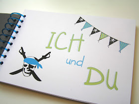 Die Seiten bestehen aus festem, 160g schwerem weißen Papier. Abwechselnd wurde je eine Doppelseite mit Marienkäfern und Pilze in orange und pink sowie eine Doppelseite mit Piratenmotiven in blau, grün und schwarz angeordnet. Zwischen den Doppelseiten befinden sich noch Pergamentkartonseiten, auf denen sich die Freunde mit Malereien verewigen können. Ich habe das Ganze unter das Thema "Ich und Du" gestellt. Folglich ist die erste Doppelseite die "Ich"-Seite, auf der sich die Besitzerin bzw. der Besitzer des Albums vorstellt. Die folgenden Seiten sind dann "Du"-Seiten, auf denen sich die Freunde vorstellen. Das Cover kann selbstverständlich je nach Wunsch mit dem entsprechenden Namen des Kindes versehen werden.